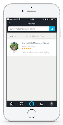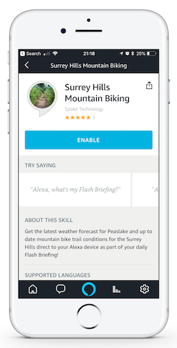 You'll get the latest weather forecast for Peaslake and up to date mountain bike trail conditions for the Surrey Hills direct to your Alexa device as part of your daily Flash Briefing!